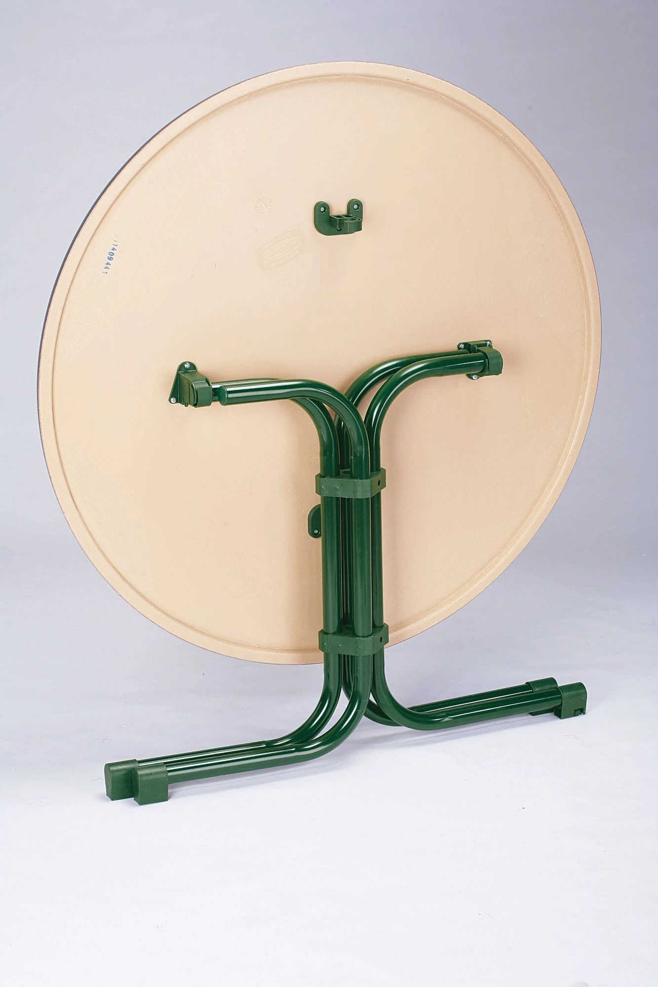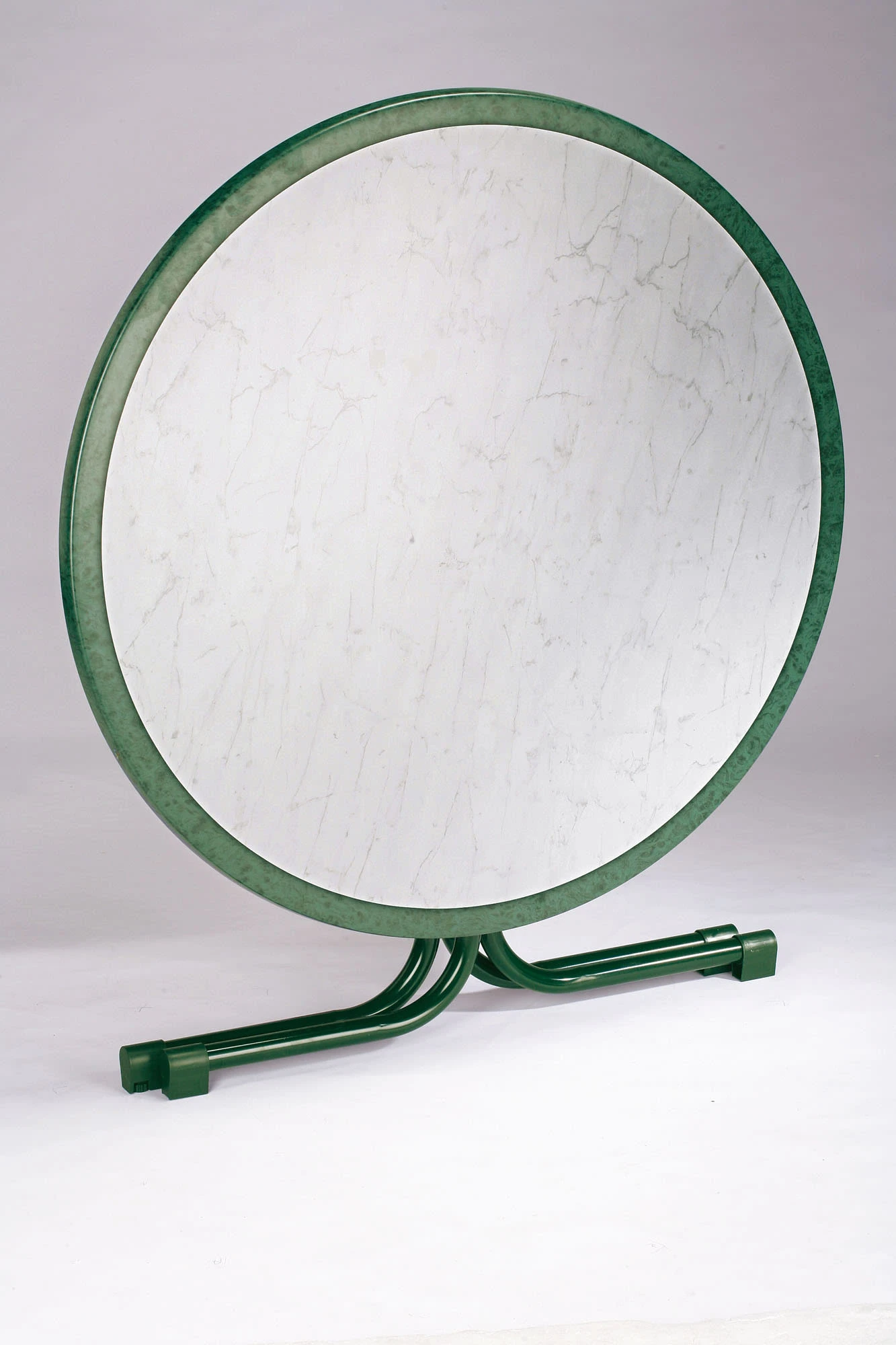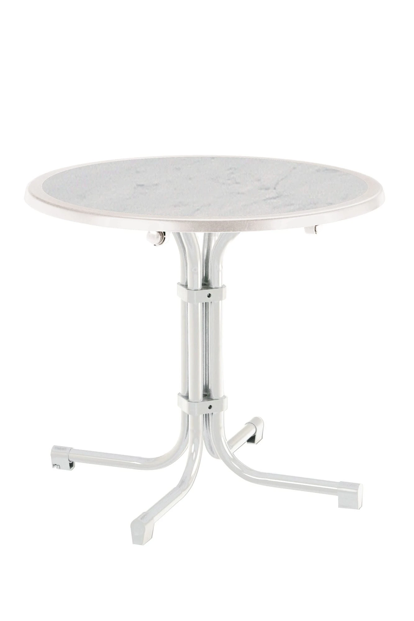 Die extrem strapazierfähige Werzalit-Tischplatte ist absolut wetterfest und pflegeleicht. Sie besitzt eine weiße Oberflächenmarmorierung und hat keine Kanten und Fugen. Die Platte ist kratzfest, hitzebeständig und belastbar. Das stabile und standfeste Stahlrohrgestell mit doppeltem Klappmechanismus und Sicherheitsbügel ist weiß pulverbeschichtet. Mit wenigen Handgriffen wird die Platte abgeklappt und das Fußgestell einfach seitlich eingeschwenkt. Dank der Niveauausgleichsschraube kann die optimale Standfestigkeit auf unebenem Boden eingestellt werden. rund 80 cm Ø / Tischhöhe: 72 cm
