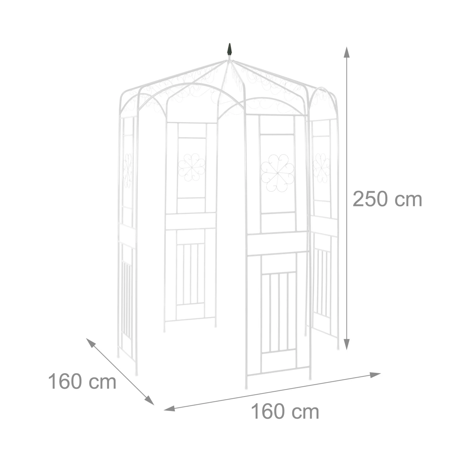 Dieser Rosenpavillon aus pulverbeschichtetem Metall gibt nicht nur Rank- und Kletterpflanzen den nötigen Halt beim Wachsen, sondern ist auch selbst äußerst hübsch anzusehen. Mit seinen floralen Verzierungen und der fürstlichen Spitze trägt die Rosenrankhilfe zur dekorativen Gartengestaltung im romantischen Stil bei. Zier- und Nutzpflanzen wie Efeu, Rosen, Clematis oder Wein werden mit dem freistehenden Rankgerüst gekonnt in Szene gesetzt. Unter dem berankten Metallpavillon können Sie sich eine gemütliche Sitzecke einrichten, wo Sie das natürliche Flair der Pflanzen entspannt genießen können.